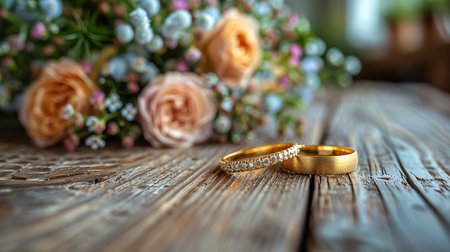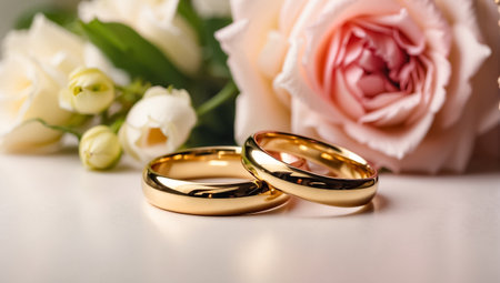 To golden wedding rings lie on wood flooring by beautiful white rose bouquet out of focus. Weds ring blank space retro background