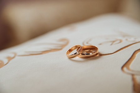 Pair of gold wedding rings on the table