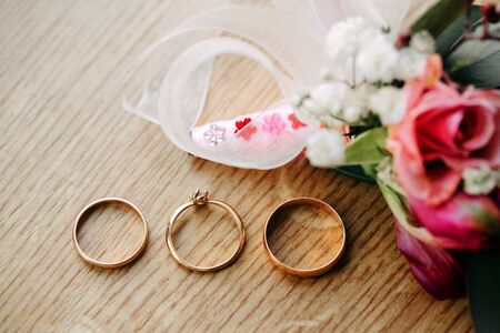 Two golden wedding rings on a table of light wood and a bouquet of bride. Horizontal format. Indoors. Color Photo