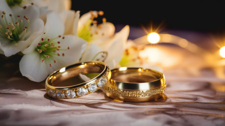 Two golden wedding rings sparkle in soft candlelight, surrounded by warm bokeh and a cozy ambiance.