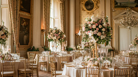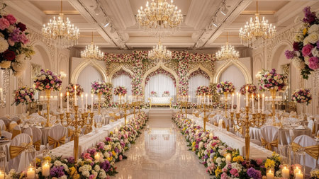 luxury event decor, the opulent event halls grand ballroom is embellished with elegant floral displays, detailed candelabras, and ornate ceiling moldings, radiating sophistication