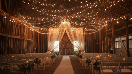 A rustic barn decorated with string lights and draped fabric, ready for a romantic wedding ceremony