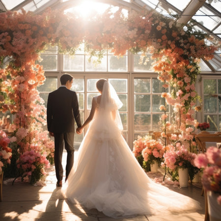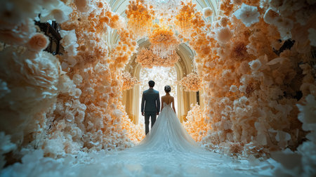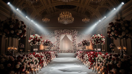 An indoor ballroom setting features an elaborately decorated wedding ceremony scene. Rows of flowers lead to a floral arch, illuminated by spotlights. The scene presents a soft color palette with a focus on light and shadow, potentially suitable for romantic or event-related visual content.