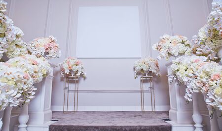 Wedding interior with flowers. Wedding decoration in the palace.