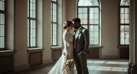 Wedding couple, bride and groom in a room with big windows