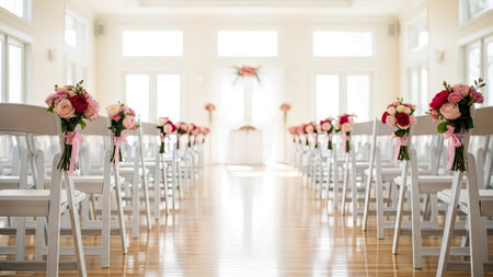 Rows of white chairs adorned with pink and red flowers in an empty wedding venue.