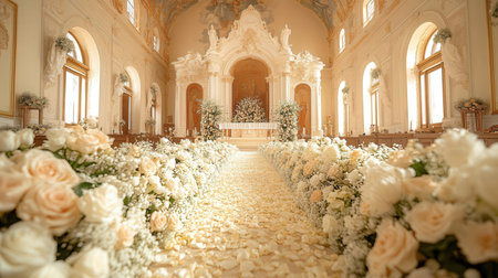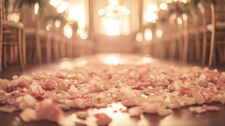 A soft-focus shot of a rose petal-strewn aisle in a wedding venue, with elegant lighting creating a dreamy feel.