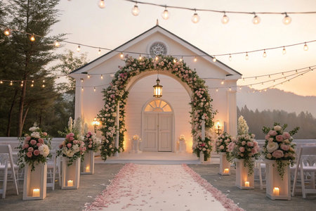 Romantic outdoor wedding ceremony setup at a charming white chapel with floral arch, aisle, and string lights.