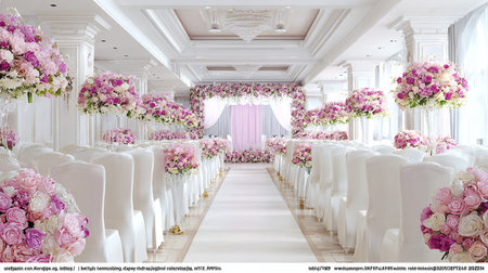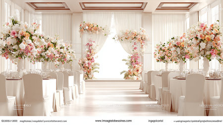 Wedding Banquet Hall Decorated with Flowers and Arch