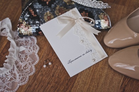 Wedding invitations. Wedding details of the bride. Bridal bouquet and other accessories. Shoes of the bride
