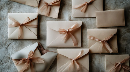 An aesthetic arrangement of elegant cream envelopes adorned with soft ribbons on a textured background, perfect for wedding invitations and special event decor.