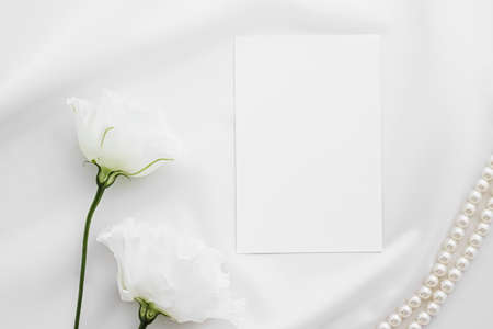 Wedding invitation, white rose flowers and pearls on silk fabric as bridal flatlay background, blank paper greeting card and holiday branding, flat lay design