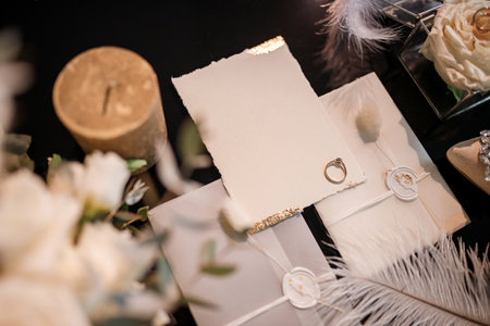 Close-up shot features invitation cards and wedding rings displayed on a wooden surface. Soft lighting illuminates the scene, highlighting the textures of the wood and stationery. This image is suitable for event planning, design, or lifestyle content, and ideal for commercial purposes.