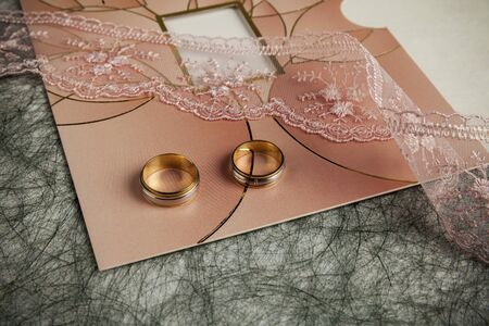 Close up Two beautiful stylish gold narrow wedding rings of the bride and groom on designer white paper with pink pictures and black letters. Wedding accessories, jewelry.