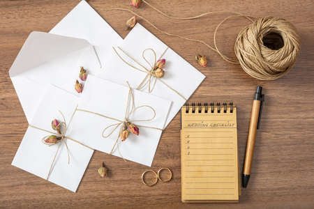 Wedding preparation. Flat lay and top view of checklist and wedding invitations on a wooden tabletop, copy space.