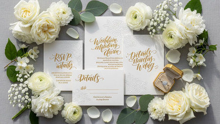 A collection of wedding invitations and RSVP cards adorned with white roses, ranunculus, eucalyptus, and a gold...