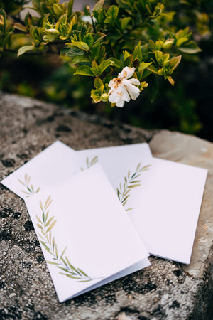 Blank postcards with ornaments lie on a stone tile under a blooming green bush