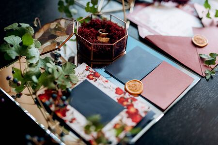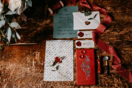 Wedding invitation cards, craft envelopes. Overhead view. Top view. Wedding style for magazines and websites, copyspace, fashion, bohemian, flowers decoration businesses, florist and other related sub