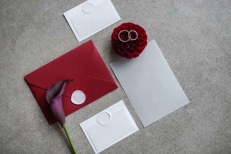 Wedding details flat lay. Wedding invitation. Ring box. Wedding bouquet. Copy space. Mock up. Envelope.