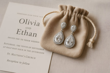 Stylish teardrop diamond earrings resting on a pouch next to a wedding invitation, symbolizing love, commitment, and celebration