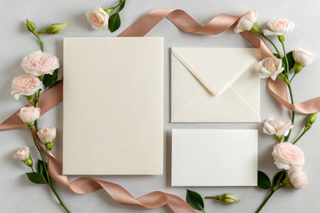 Wedding invitation or greeting card mockup with envelope, roses and ribbons.