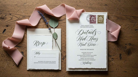 A beautiful wedding invitation suite is displayed on a soft surface. The invitations feature floral designs and elegant typography, accompanied by a delicate white flower and greenery.