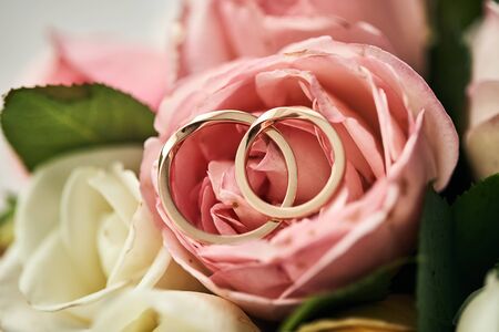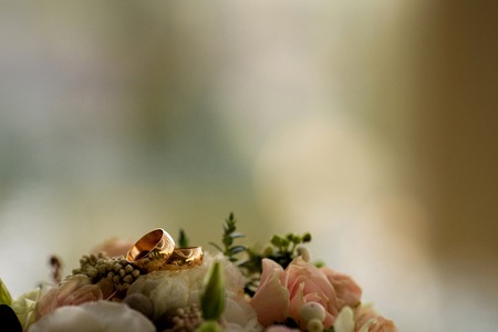 two golden wedding rings lie on the bouquet of flowers
