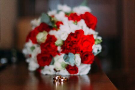 Two golden wedding rings on a table of light wood and a bouquet of bride. Horizontal format. Indoors. Color Photo