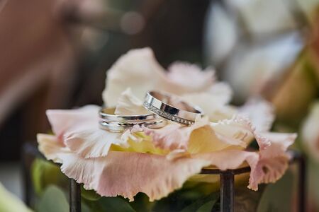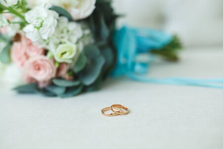 Wedding rings of the bride and groom on the background of a bouquet. Wedding concept