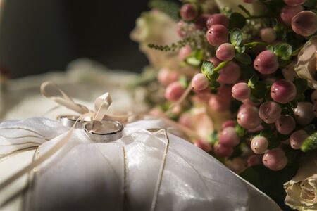 Beautiful Wedding rings on the bouquet. morning bride