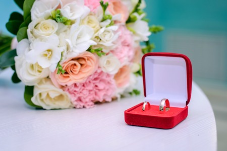 Gold wedding rings in a red box with a beautiful delicate bouquet of pink and white roses
