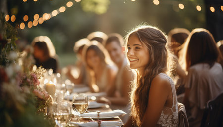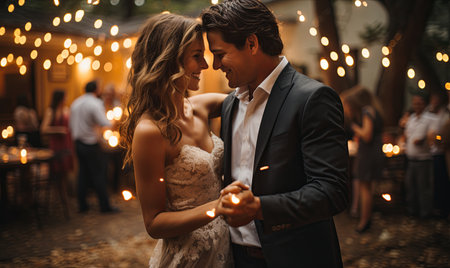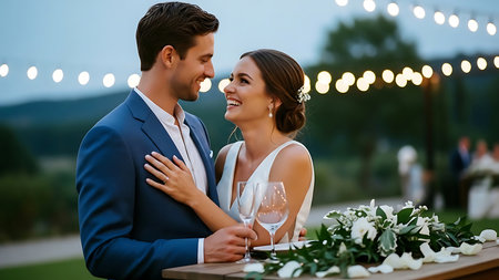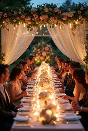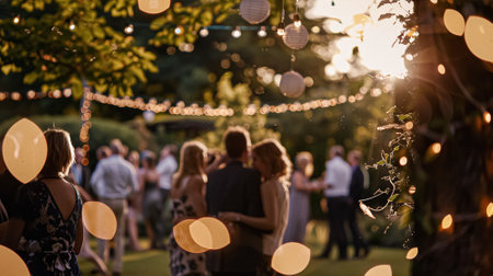 Outdoor wedding reception, warm glow of the lights creates a magical atmosphere as guests gather, the background is slightly blurred, joyful ambiance of the celebration, romantic and festive evening wedding celebration