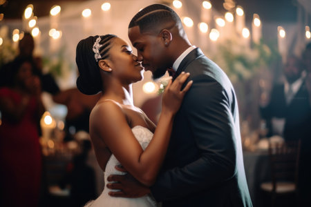 First wedding dance of african american newlywed couple. Generative AI.