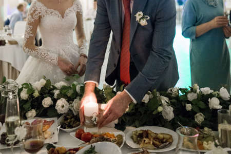 Cuman, Volyn / Ukraine - April 29 2018: Wedding couple on party at restaurant. Shallow depth of field.