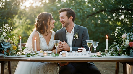 Wedding ceremony and celebration, bride and groom at a beautiful outdoor venue on a sunny day, luxury wedding decor with flowers and bridal bouquet, post-processed, generative ai