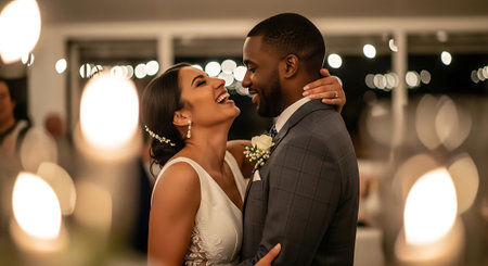 A joyful bride and groom share a tender moment, smiling and embracing each other at their wedding reception, surrounded by blurred lights and decorations.