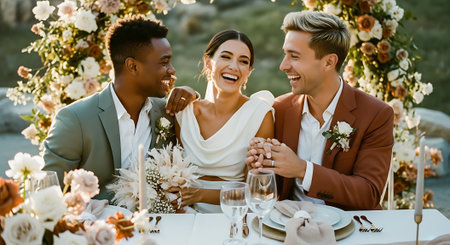 Three people, two men and one woman, sitting at a decorated table with flowers, smiling and holding hands in a celebratory atmosphere.
