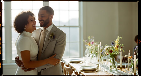 A smiling African American man and woman in formal attire embracing in a brightly lit room with a decorated table and flowers in the background.