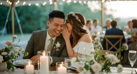 A smiling Asian couple sits at a decorated table with candles and flowers, sharing a tender moment at their outdoor wedding reception with guests in the background.