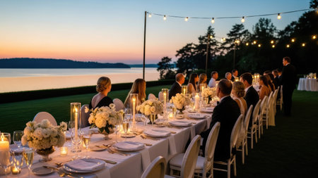 Romantic Outdoor Wedding Reception at Sunset with Elegant Floral Centerpieces