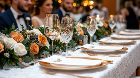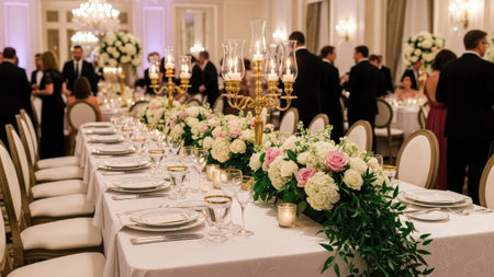 Elegant candlelit banquet table with floral centerpieces and fine tableware in lavish setting. That the image is generated using AI