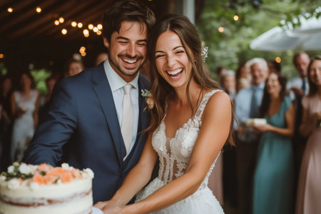 Happy bride and groom laughing and cutting wedding cake at reception, celebrating their new marriage with family and friends