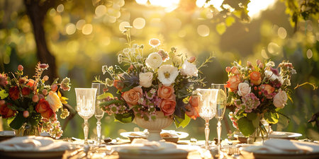 Outdoor dining table adorned with beautiful floral centerpieces in soft hues, crystal glassware reflecting sunlight, creating a warm and inviting ambiance for gatherings and celebrations