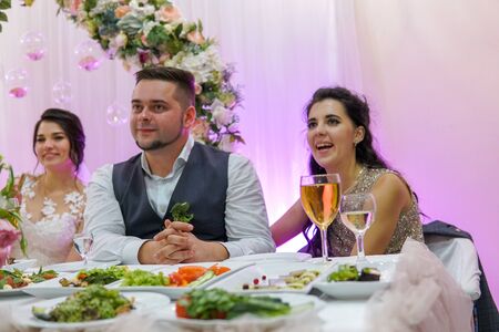 portrait of the newlyweds at the presidium at the wedding banquet