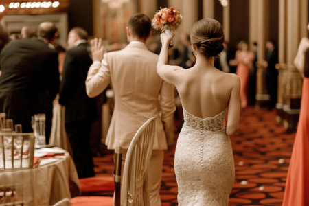 Elegant Wedding Celebration: Newlyweds Enter Reception Hall in Festive Atmosphere.