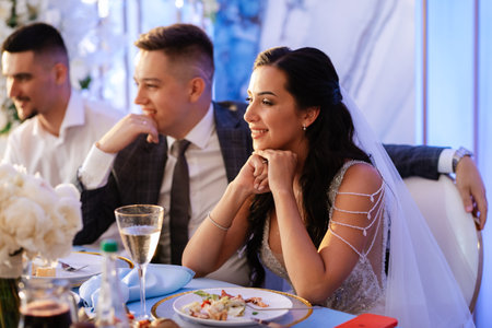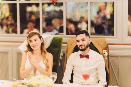 Newlyweds sit and smile with glasses at the banquet table in the evening. High quality photo
