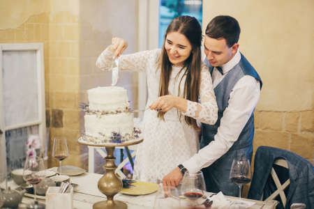 Stylish happy bride and groom cutting together modern cake with lavender on background of festive table in stylish restaurant. Provence wedding reception. Beautiful wedding couple celebrating