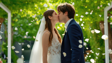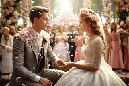Beautiful traditional wedding ceremony with a happy groom and bride showering each other with delicate rose petals, expressing love and joy on their special day.