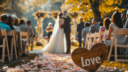 Romantic outdoor wedding ceremony with a couple surrounded by autumn foliage and colorful flowers at golden hour Generative AI