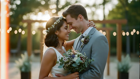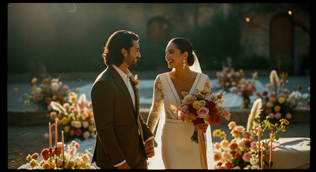 Wedding ceremony and celebration, bride and groom at a beautiful outdoor venue on a sunny day, luxury wedding decor with flowers and bridal bouquet, post-processed, generative ai